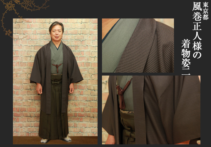 着物も袴も、気に入った色は30年以上経っても愛用します。この装いは男らしい竹内様にぴったりです。